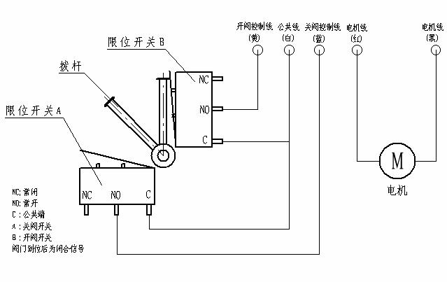 4)執(zhí)行機(jī)構(gòu)引出線中:紅色線為電機(jī)正極引出線,黑色線為電機(jī)負(fù)極引出線,黃色線為開閥到位引出線,藍(lán)色線為關(guān)閥到位引出線,白色線為閥到位公共線。