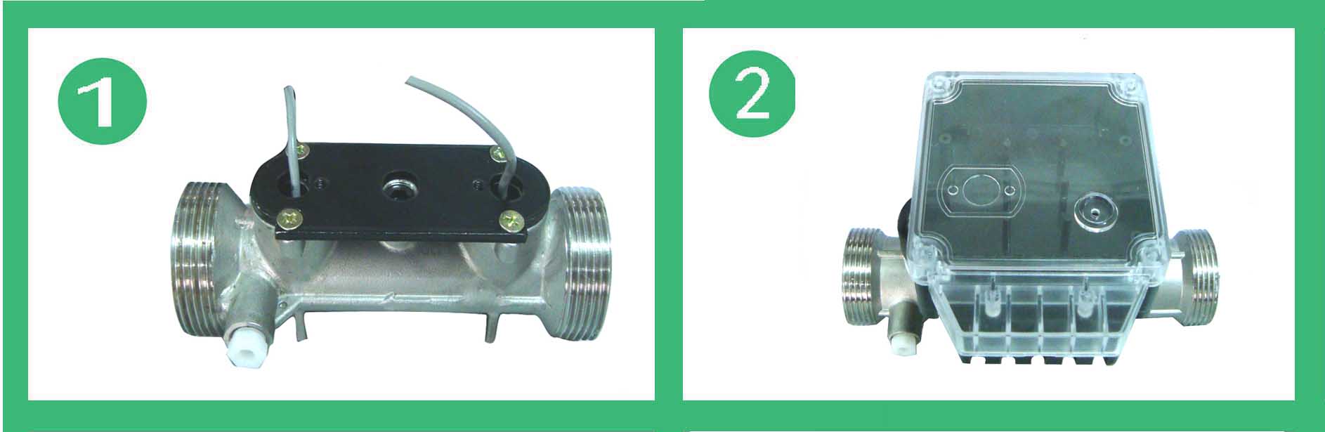 b.樓棟型熱量表超聲波流量計由表殼、換能器、換能器座組成。順流方向和逆流方向,換能器1或換能器2發(fā)射的超聲波信號由換能器2或換能器1接收。