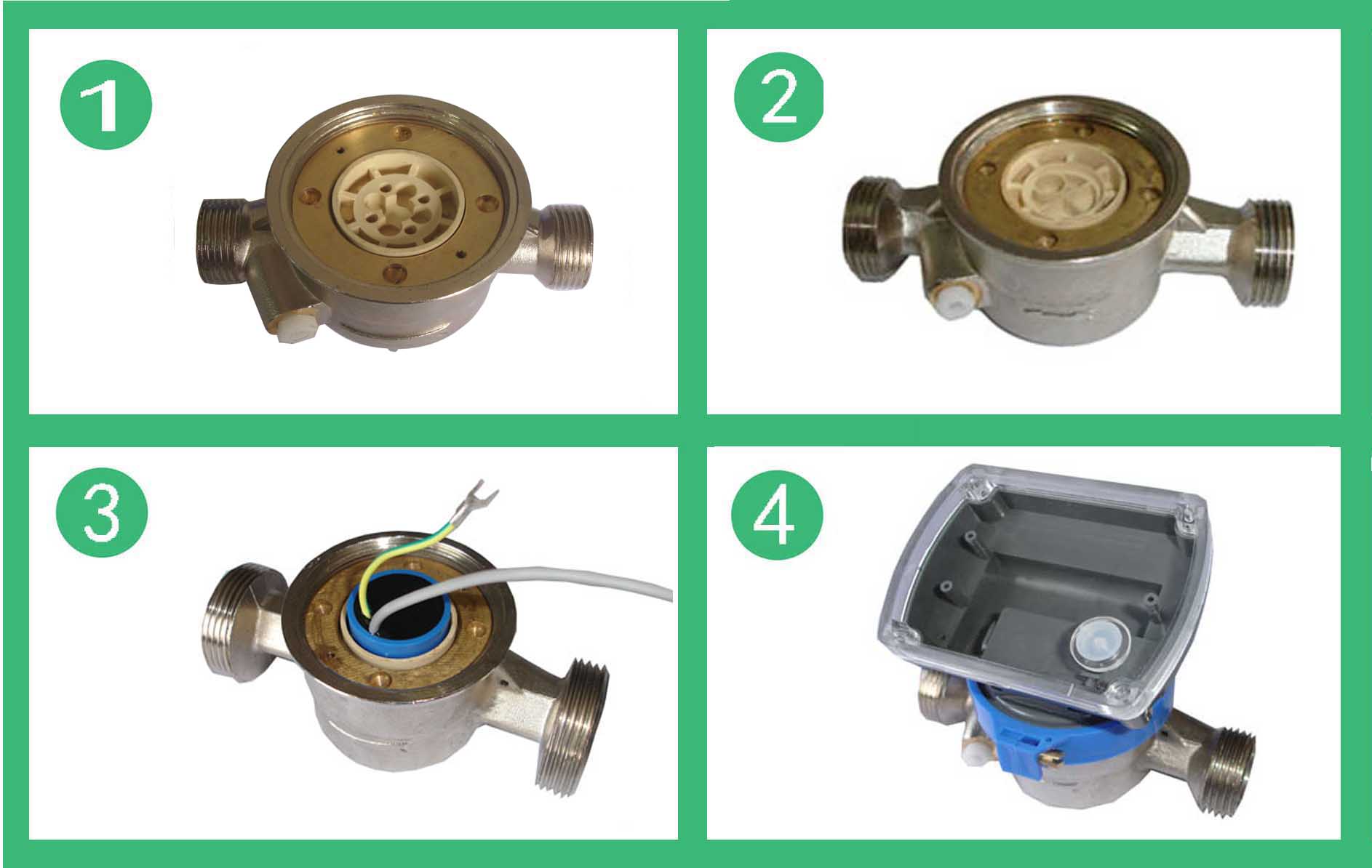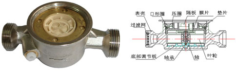 CD02TAR單流束無磁熱量表流量計的結(jié)構(gòu)如圖,其工作原理是:熱水進(jìn)入流量計,經(jīng)進(jìn)水導(dǎo)向孔沖擊計量腔內(nèi)的葉輪旋轉(zhuǎn),再經(jīng)出水導(dǎo)向孔流出流量計。葉輪上面嵌有不銹鋼膜片,隨葉輪旋轉(zhuǎn),在隔板上端接近不銹鋼膜片處可裝電感類傳感器,接受葉輪旋轉(zhuǎn)的周期信號。